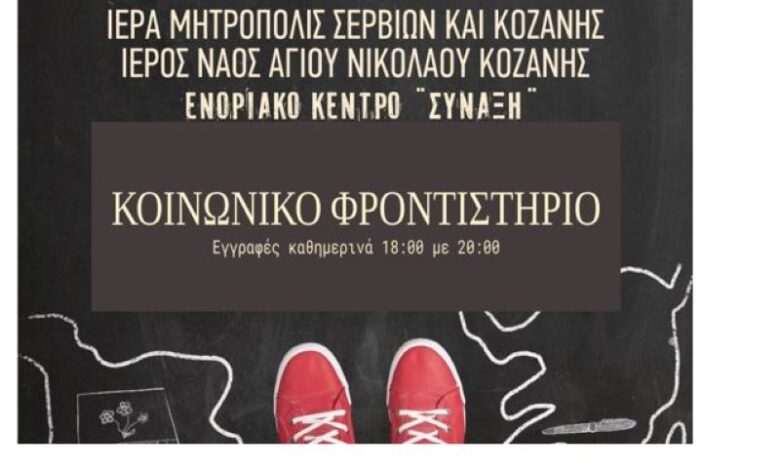 Το Κοινωνικό Φροντιστήριο της Ιεράς Μητροπόλεως Σερβίων και Κοζάνης θα λειτουργήσει και φέτος στο Μπλιούρειο Εκκλησιαστικό Ίδρυμα (στον 1ο όροφο απέναντι από τον Άγιο Νικόλαο). Οι εγγραφές ξεκινούν από τη Δευτέρα 18 Αυγούστου, 6-8 το απόγευμα. Θα δοθεί προτεραιότητα στις εγγραφές των μαθητών της Γ’ Λυκείου μιας και πρόκειται να δημιουργηθούν κλειστά ολιγομελή τμήματα, τα μαθήματα των οποίων θα ξεκινήσουν τη Δευτέρα 1 Σεπτεμβρίου.