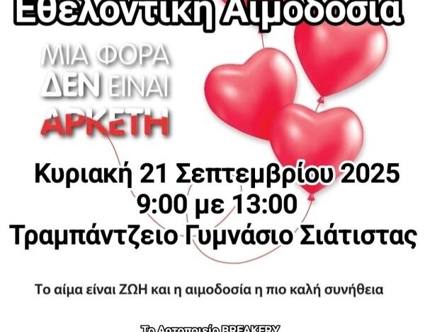 Ο Σύλλογος Εθελοντών Αιμοδοτών Σιάτιστας “Ο Άγιος Παντελεήμων” θα πραγματοποιήσει Εθελοντική Αιμοδοσία, την Κυριακή 21 Σεπτεμβρίου 2025 στο Τραμπάντζειο Γυμνάσιο Σιάτιστας, από τις 9:00 π.μ. εώς τη 13:00 μ.μ..