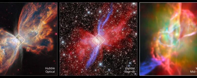 Τρεις απόψεις του Νεφελώματος Πεταλούδα, επισήμως γνωστού ως NGC 6302, από τα τηλεσκόπια Hubble και James Webb