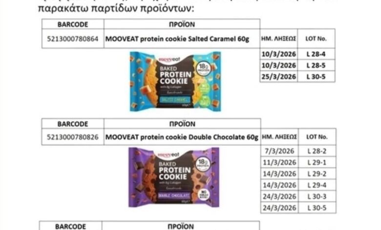 Ανακαλούνται τα μπισκότα πρωτεΐνης της εταιρείας MOOVeat, μετά από παράπονα καταναλωτών για μούχλα.