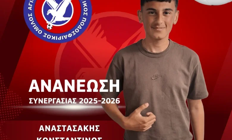 “Η ομάδα μας ανακοινώνει την ανανέωση της συνεργασίας με τον μεσοεπιθετικό Αναστασάκη Κωνσταντίνο. Ο Κωνσταντίνος είναι 16,5 χρονών και είναι δεύτερη χρονιά που αγωνίζεται στην ομάδα μας . Ευχόμαστε καλή ποδοσφαιρική σαιζόν με υγεία”!