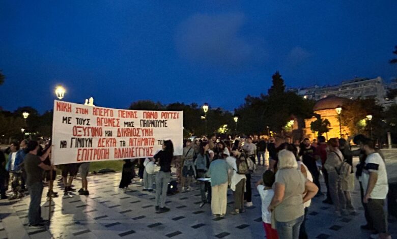 Συγκέντρωση αλληλεγγύης πραγματοποιείται στο άγαλμα Βενιζέλου στη Θεσσαλονίκη για τον Πάνο Ρούτσι, πατέρα του 22χρονου Ντένις που σκοτώθηκε στην τραγωδία των Τεμπών και από τις 15 Σεπτεμβρίου βρίσκεται σε απεργία πείνας έξω από τη Βουλή.