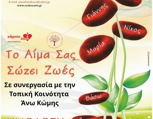 Διοργανώνεται αιμοδοσία στην Άνω Κώμη, την Τετάρτη 4 Ιουνίου 2025 από τις 15:30 – 20:00 στο Πνευματικό Κέντρο, σε συνεργασία με την Κοινότητα Άνω Κώμης, τον ΣΕΑ Κοζάνης «Γέφυρα Ζωής» και την Αιμοδοσία του «Μαμάτσειου» Γ.Ν. Κοζάνης