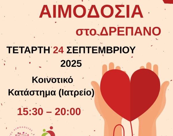 Την Τετάρτη 24 Σεπτεμβρίου 2025 και ΩΡΑ 15:30-20:00 (προσέλευση μέχρι 19:30) στον χώρο του Κοινοτικού Ιατρείου του Δ.Δ. Δρεπάνου θα γίνει Αιμοδοσία σε συνεργασία με την Τοπική Κοινότητα, Πολιτιστικό Σύλλογο & Σύλλογο Γονέων και Κηδεμόνων Δημοτικού – Νηπιαγωγείου Δρεπάνου & τον Σταθμό Αιμοδοσίας του Γ.Ν. Κοζάνης.