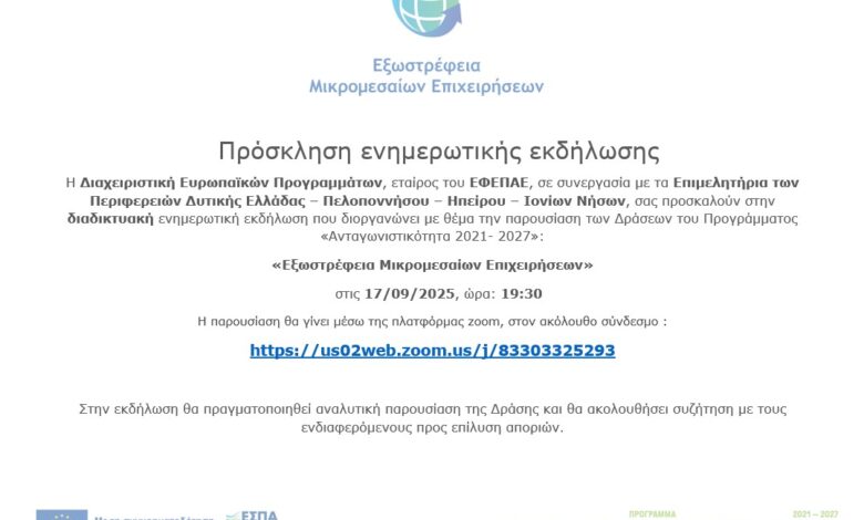 Η Διαχειριστική Ευρωπαϊκών Προγραμμάτων, εταίρος του ΕΦΕΠΑΕ, σε συνεργασία με τα Επιμελητήρια των Περιφερειών Δυτικής Ελλάδας – Πελοποννήσου – Ηπείρου – Ιονίων Νήσων, προσκαλούν στην διαδικτυακή ενημερωτική εκδήλωση που διοργανώνει.