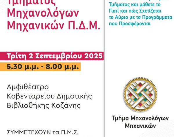 Το Τμήμα Μηχανολόγων Μηχανικών του Πανεπιστημίου Δυτικής Μακεδονίας, σας προσκαλεί σε εκδήλωση παρουσίασης των Μεταπτυχιακών Προγραμμάτων του Τμήματος την Τρίτη 2/9 στις 5.30 στο Αμφιθέατρο της Κοβενταρείου Δημοτικής Βιβλιοθήκης. Θα ενημερωθείτε για τα τρέχοντα Προγράμματα Μεταπτυχιακών Σπουδών όπως και για γενικότερα θέματα λειτουργίας των Μεταπτυχιακών. Θα χαρούμε να μας τιμήσετε με την παρουσία σας.