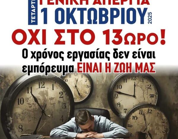 Για μία ακόμα φορά, εργαζόμενοι, συνταξιούχοι, άνεργοι, οδηγούνται στον δρόμο της δυναμικής διεκδίκησης μέσα από τη συμμετοχή στην 24ωρη Γενική Απεργία (την Τετάρτη 1η Οκτωβρίου 2025), το συλλαλητήριο των συνδικάτων και τις συγκεντρώσεις διαμαρτυρίας.