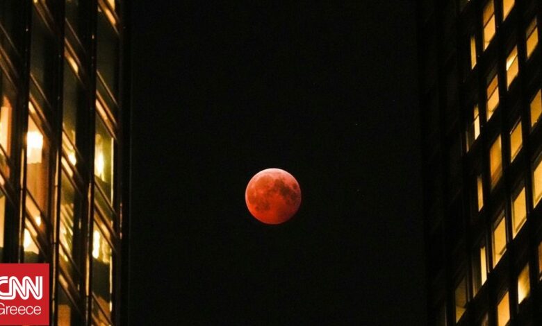 Τα εντυπωσιακά πλάνα δείχνουν το «Ματωμένο Φεγγάρι» να λάμπει με μια βαθιά, κόκκινη απόχρωση καθώς κινείται αργά μέσα στη σκιά της Γης.