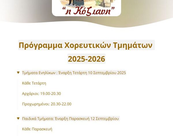 Ανακοινώνεται ότι την προσεχή Τετάρτη 10 Σεπτεμβρίου 2025 (τμήματα ενηλίκων) και την Παρασκευή 12 Σεπτεμβρίου 2025 (παιδικά τμήματα), ξεκινούν τα μαθήματα  παραδοσιακού χορού από τον Πολιτιστικό και Λαογραφικό Σύλλογο Κοζάνης «Η Κόζιανη» για την σεζόν 2025 -2026.