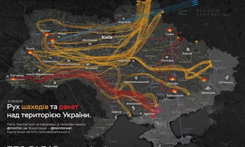 Ο τροχιά ρωσικών πυραύλων και drones προς την Ουκρανία, την Πέμπτη 21 Αυγούστου 2022.