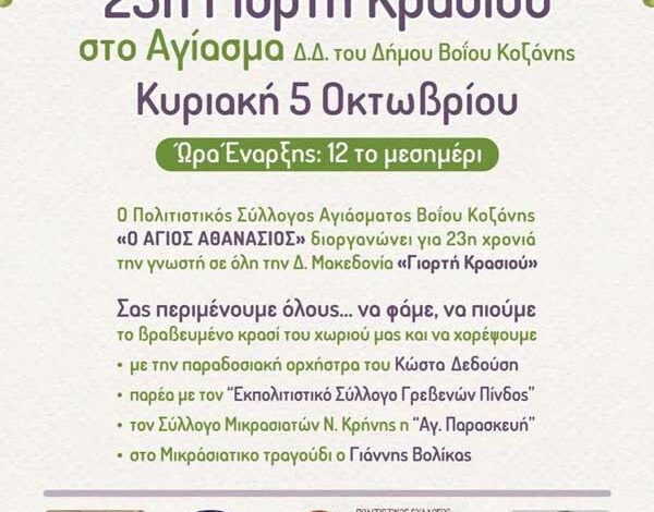 Ο Πολιτιστικός Σύλλογος Αγιάσματος Βοΐου Κοζάνης «Ο ΑΓΙΟΣ ΑΘΑΝΑΣΙΟΣ» διοργανώνει για 23η χρονιά τη γνωστή σε όλη τη Δυτικη Μακεδονία, «Γιορτή Κρασιού».