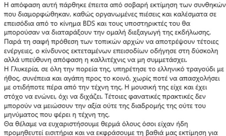 Η πολυαναμενόμενη εμφάνιση της Γλυκερίας στο Sani Festival στο αφιέρωμα για τη Λίνα Νικολακοπούλου δεν θα πραγματοποιηθεί, καθώς η ομάδα της γνωστοποίησε την ακύρωση λόγω των αντιδράσεων και των καλεσμάτων του κινήματος BDS που συνδέονταν με το γεγονός.