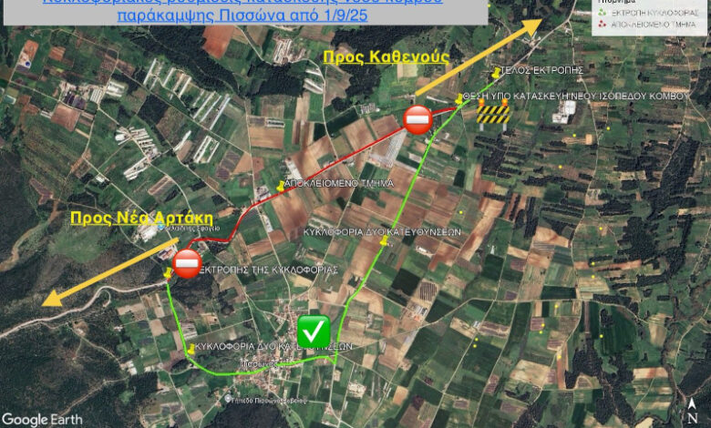 Οι κυκλοφοριακές ρυθμίσεις θα είναι διάρκειας ενός (1) μήνα, εκτός απροόπτων γεγονότων, και κατά την εφαρμογή τους θα γίνεται ευρεία εκτροπή της κυκλοφορίας επί της Ε.Ο 11 (στην 7,5 χ.θ. και για τις δύο κατευθύνσεις) στη περιοχή του υφιστάμενου κόμβου Πισσώνα και εν συνεχεία η κυκλοφορία (και για τις δύο κατευθύνσεις) θα  διεξάγεται μέσω του οικισμού  Πισσώνα και μέσω της οδού που παρακάμπτει τον Πισσώνα βάσει του συνημμένου αποσπάσματος χάρτη που επισυνάπτεται.