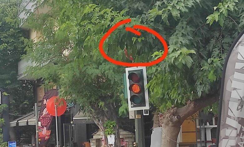 Σύμφωνα με τα όσα αναφέρει κάτοικος της περιοχής σε ανάρτησή του σε μέσο κοινωνικής δικτύωσης, τα κλαδιά του δέντρου πίσω από τον φωτεινό σηματοδότη, κρύβουν την πινακίδα κυκλοφορίας που ορίζει ότι απαγορεύεται η στροφή προς τα αριστερά.