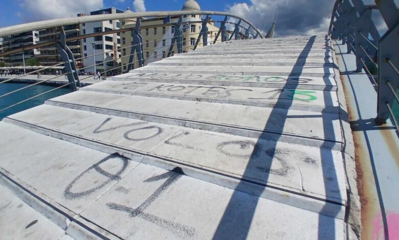 Καθημερινά, εκατοντάδες πολίτες –ανάμεσά τους ηλικιωμένοι, αθλούμενοι, οικογένειες με παιδιά αλλά και επισκέπτες της πόλης– επιλέγουν τον περίπατο προς τον κυματοθραύστη για λίγη ανάσα και εικόνες καρτ ποστάλ από τον Παγασητικό. Αντί όμως για αισθητική αναβάθμιση, αυτό που αντικρίζουν είναι ένα γεφυράκι λερωμένο, γεμάτο συνθήματα και μουτζούρες με σπρέι, σε κάθε σημείο της επιφάνειάς του, μία κουπαστή ξύλινη που έχει ξεφτίσει από τον χρόνο και σκουριά στα μεταλλικά του μέρη.