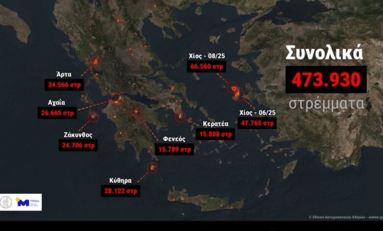 Σύμφωνα με τα στοιχεία του Ευρωπαϊκού Συστήματος Πληροφοριών για τις Δασικές Πυρκαγιές (EFFIS) που ανέλυσε το Εθνικό Αστεροσκοπείο Αθηνών / meteo.gr, από την αρχή του έτους έως και το τέλος Αυγούστου κάηκαν συνολικά 473.930 στρέμματα, γεγονός που κατατάσσει το 2025 στην πέμπτη θέση ανάμεσα στις πιο καταστροφικές αντιπυρικές περιόδους των τελευταίων 20 ετών μέχρι στιγμής.