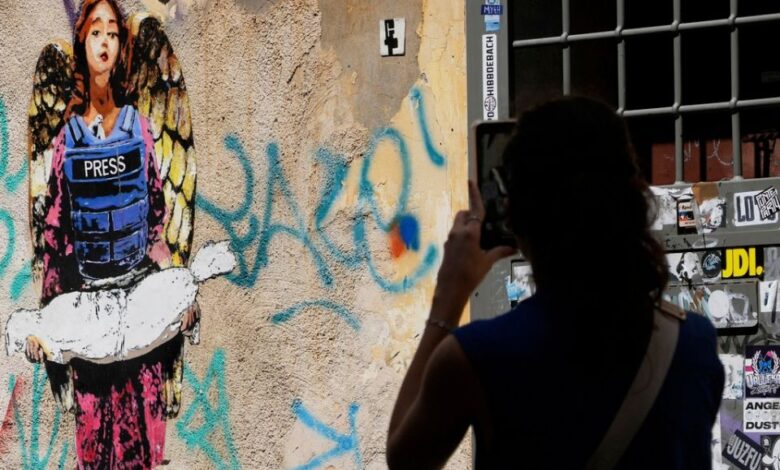Μια γυναίκα φωτογραφίζει την εικόνα «The Angel» που ζωγράφισε ο street artist Χάρι Γκρεμπ, αφιερωμένη στους δημοσιογράφους που σκοτώθηκαν στη Γάζα