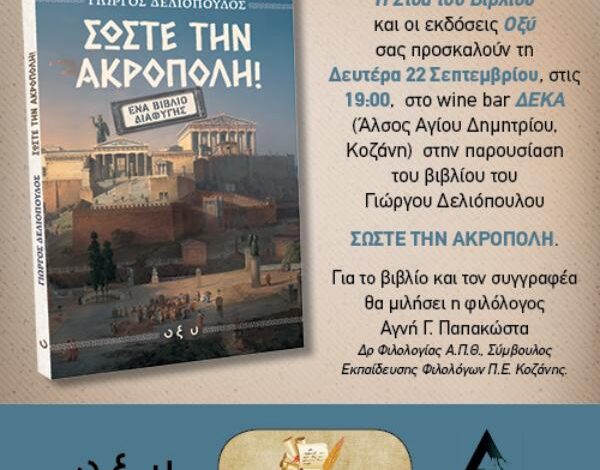 Το βιβλιοπωλείο η Στοά του βιβλίου και οι εκδόσεις Οξύ σας προσκαλούν τη Δευτέρα 22 Σεπτεμβρίου στις 19:00, στο wine bar ΔΕΚΑ (Αλσος Αγίου Δημητρίου) στην παρουσίαση του βιβλίου του Γιώργου Δελιόπουλου “Σώστε την Ακρόπολη”.