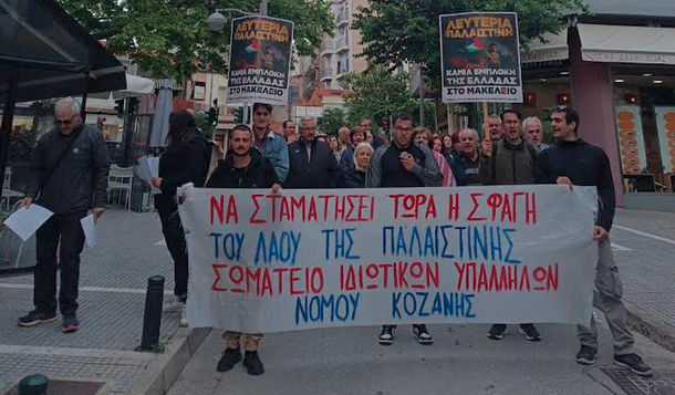 Μαχητική κινητοποίηση πραγματοποιήθηκε στην Κοζάνης μετά από κάλεσμα του Σωματείου Ιδιωτικών Υπαλλήλων Νομού Κοζάνης για να εκφραστεί η αλληλεγγύη του λαού στον λαό της Παλαιστίνης.