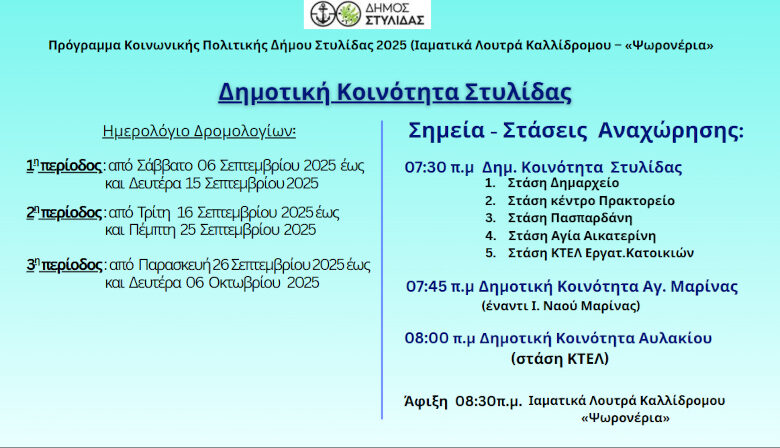 Ο Δήμος Στυλίδας, όπως και πέρυσι, συνεχίζει και φέτος να προσφέρει, στο πλαίσιο του κοινωνικού του προγράμματος, δράσεις που δίνουν τη δυνατότητα σε όλους τους πολίτες να συμμετάσχουν σε ιαματικά λουτρά.