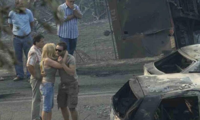 Συνολικά δέκα οχήματα βρέθηκαν εγκλωβισμένα, περικυκλωμένα από τη φωτιά, στη μέση του επαρχιακού δρόμου, τοποθεσία που το δικαστήριο αργότερα χαρακτήρισε σημείο «χωρίς ελπίδα και σωτηρία» και αυτό γιατί όπως προέκυψε οι άνθρωποι αυτοί χωρίς να το γνωρίζουν πήγαιναν στο σημείο όπου η φωτιά θα έβγαινε μέσα από μια χαράδρα. Ξαφνικά, λοιπόν, είδαν σε μια απόσταση περίπου 15-20 μέτρων ένα πύρινο μέτωπο να κινείται κατά πάνω τους.
