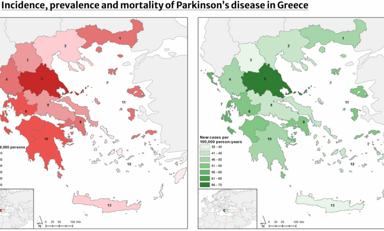 Δείτε τον σχετικό χάρτη, ο οποίος καταγράφει τον επιπολασμό και την επίπτωση της νόσου Πάρκινσον ανά γεωγραφικό διαμέρισμα: