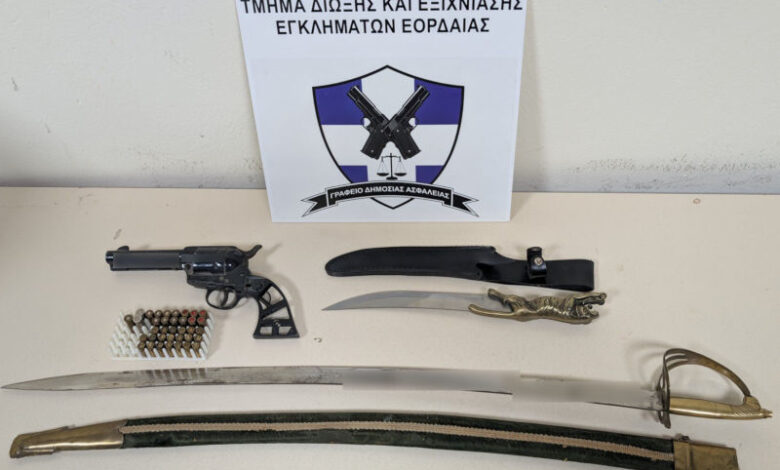 Κατά την έρευνα στην οικία του 49χρονου, οι αρχές βρήκαν και κατέσχεσαν σπαθί μήκους λάμας 76 εκατοστών, μαχαίρι 25 εκατοστών, αεροβόλο περίστροφο και 36 φυσίγγια.