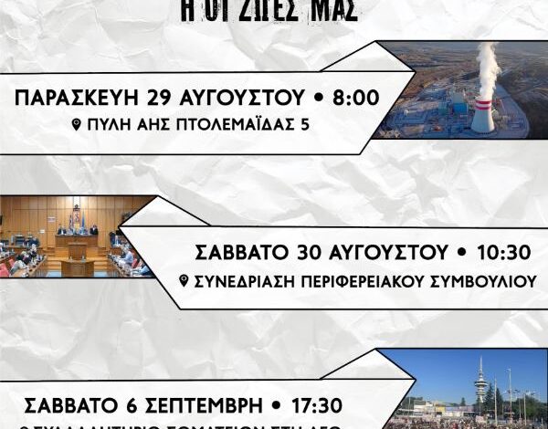 - Την Παρασκευή 29 Αυγούστου στις 8.00 π.μ. συγκέντρωση στην πύλη του ΑΗΣ «Πτολεμαΐδα 5», στον χώρο που προβλέπεται να κατασκευαστεί η μονάδα καύσης.