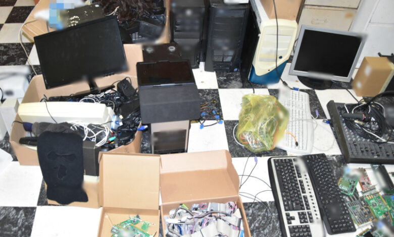 Ειδικότερα, μεταξύ άλλων, κατασχέθηκαν κεντρικές μονάδες Η/Υ, φορητοί Η/Υ (laptop), tablet, οθόνες Η/Υ, πλήθος περιφερειακών συσκευών – εξοπλισμού Η/Υ (ηχεία, «ποντίκια», πληκτρολόγια, ζεύγη ακουστικών, πλακέτες, τροφοδοτικά, κάμερες, εξωτερικοί σκληροί δίσκοι κ.λπ.), φορτιστές Η/Υ διαφόρων τύπων, πληθώρα καλωδίων διαφόρων τύπων και το χρηματικό ποσό των -610- ευρώ.