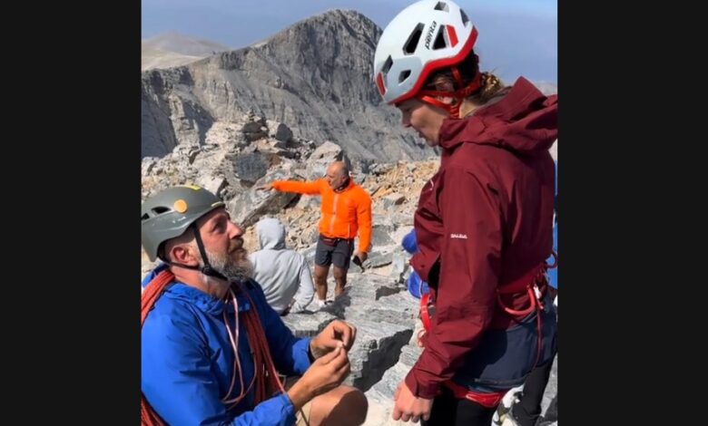 Μια ιδιαίτερη και ρομαντική πρόταση γάμου έκανε ορειβάτης στην αγαπημένη του, σε υψόμετρο 2.918 μέτρων στον Όλυμπο. Τη μοναδική σκηνή καταγράφει βίντεο που δημοσίευσε στο Instagram ο λογαριασμός Weddingbyastir και φαίνεται να τραβήχτηκε από wedding planner που συμμετείχε στην