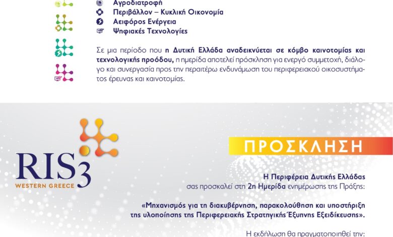 Η Περιφέρεια Δυτικής Ελλάδας διοργανώνει τη 2η Ημερίδα του Μηχανισμού Διακυβέρνησης της Περιφερειακής Στρατηγικής Έξυπνης Εξειδίκευσης (RIS3), η οποία θα πραγματοποιηθεί τη Δευτέρα 2 Φεβρουαρίου 2026, από τις 10:00 έως τις 13:00, στην Αίθουσα Συνεδριάσεων του Διοικητηρίου της Π.Ε. Αιτωλοακαρνανίας.