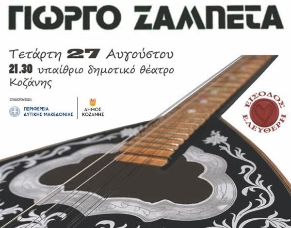 Στο πλαίσιο των 43ων Λασσανείων, ο Δήμος Κοζάνης προσκαλεί όλους τους δημότες στο μεγάλο μουσικό αφιέρωμα για τον Γιώργο Ζαμπέτα, που θα πραγματοποιηθεί από τον Σύλλογο Μουσικών Κοζάνης «ΡΕ.ΛΑ.ΡΕ» την Τετάρτη 27 Αυγούστου στις 21:30 το βράδυ στο Υπαίθριο Δημοτικό Θέατρο Κοζάνης, με ελεύθερη είσοδο για το κοινό.