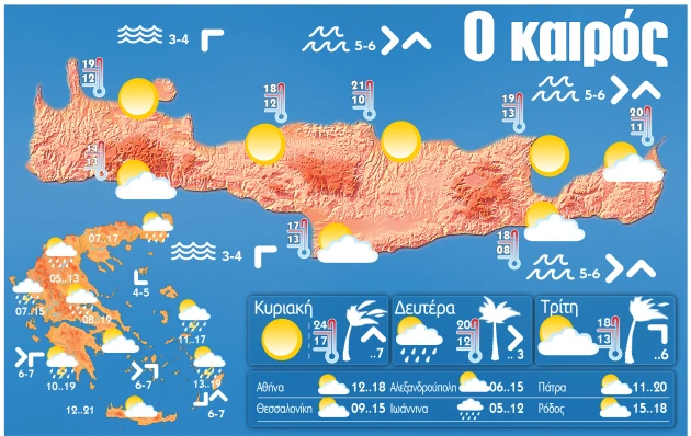 Η θερμοκρασία θα κυμανθεί από 12 έως 19 βαθμούς Κελσίου, ενώ στη βόρεια Κρήτη δεν αποκλείεται να αγγίξει τους 20 με 21 βαθμούς.