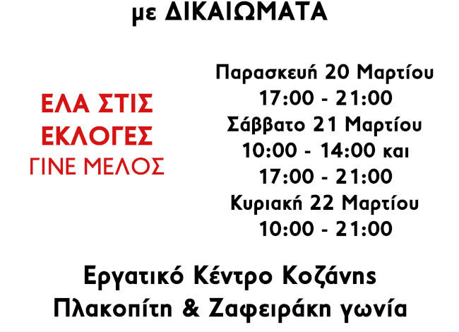 Οι αρχαιρεσίες θα διεξαχθούν στο Εργατικό Κέντρο Κοζάνης στην οδό Νικολάου Πλακοπίτη και Ζαφειράκη γωνία