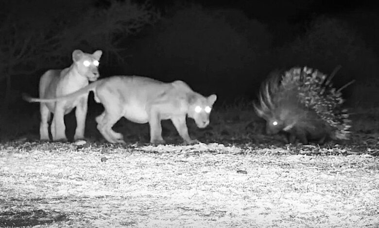 Τα νεαρά λιοντάρια προσπάθησαν να πλησιάσουν τον σκαντζόχοιρο που έπινε ήρεμος νερό σε νερόλακκο αλλά μάλλον δεν τα κατάφεραν.
