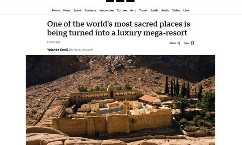 Στη Μονή Σινά και τους κινδύνους που αντιμετωπίζει λόγω των αλλαγών που προωθεί η αιγυπτιακή κυβέρνηση για την περιοχή, αναφέρεται με άρθρο του το BBC, λέγοντας πως τα σχέδια του Καΐρου για τη δημιουργία τουριστικού θερέτρου στην περιοχή απειλεί με καταστροφή το παρθένο βραχώδες τοπίο τους Όρους.