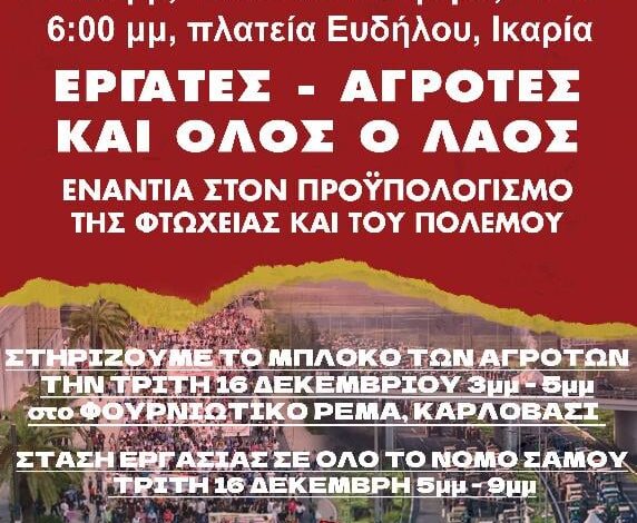 Μπλόκα αγροτών και κινητοποιήσεις από το Εργατικό Κέντρο Σάμου την Τρίτη 16 Δεκεμβρίου