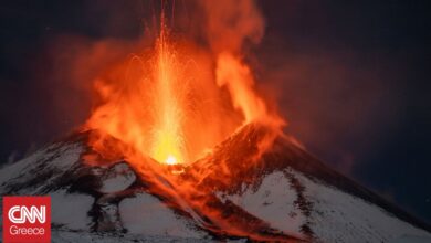 Εντυπωσιακές εικόνες: «Ξύπνησε» πάλι η χιονισμένη Αίτνα – Εκτοξεύει τέφρα και καπνό