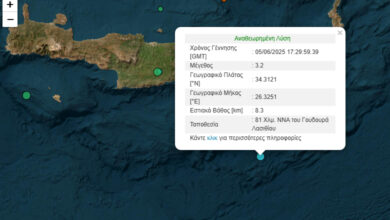 Σεισμός της τάξεως των 3,2 βαθμών της κλίμακας Ρίχτερ, σημειώθηκε σε θαλάσσια περιοχή 81 Χλμ. ΝΝΑ του Γουδουρά Λασιθίου, με…