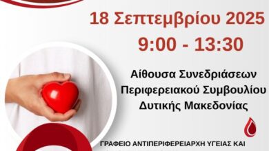 Την Πέμπτη 18 Σεπτεμβρίου 2025 και ώρα 09:00 – 13:30, θα πραγματοποιηθεί ανοιχτή εθελοντική αιμοδοσία, στο Διοικητήριο της Περιφερειακής Ενότητας Κοζάνης (πρώην…