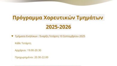 Ανακοινώνεται ότι την προσεχή Τετάρτη 10 Σεπτεμβρίου 2025 (τμήματα ενηλίκων) και την Παρασκευή 12 Σεπτεμβρίου 2025 (παιδικά τμήματα), ξεκινούν τα…