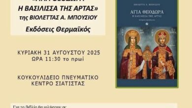 Δήμος Βοΐου: Πολιτιστικό καλοκαίρι – Κυριακή 31 Αυγούστου – Παρουσίαση Βιβλίου στη Σιάτιστα «ΑΓΙΑ ΘΕΟΔΩΡΑ Η ΒΑΣΙΛΙΣΣΑ ΤΗΣ ΑΡΤΑΣ»…