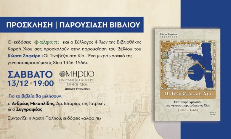 Το βιβλίο του ιστορικού Κώστα Ζαφείρη «Οι Γενοβέζοι στη Χίο – Ένα μικρό χρονικό της Γενουατοκρατούμενης Χίου (1346-1566)» θα παρουσιαστεί το Σάββατο 13 Δεκεμβρίου 2025 στις 7.00 μ.μ. στην Αίθουσα Συνεδρίων του Ομηρείου Πνευματικού Κέντρου Δήμου Χίου.