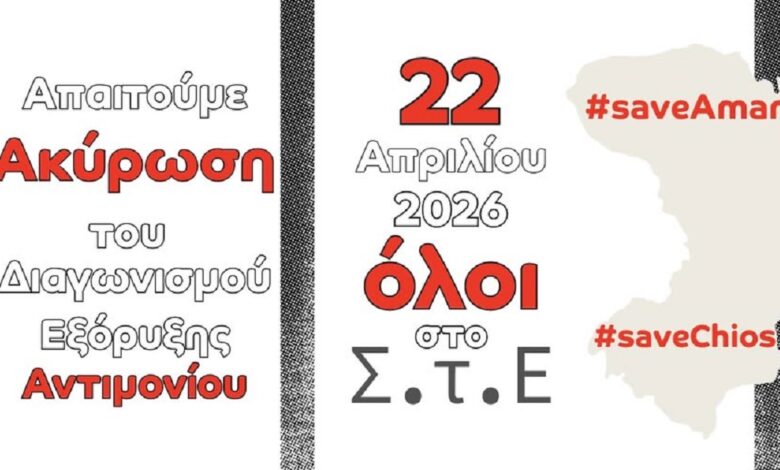 Όπως υπενθυμίζεται στο δελτίο τύπου «στις 22 Απριλίου 2026, εκδικάζονται στο Συμβούλιο της Επικρατείας οι δύο αιτήσεις ακυρώσεως της απόφασης με ΑΔΑ: Ρ1864653Π8-ΙΓΡ (20/01/2025), με την οποία το Υπουργείο Περιβάλλοντος και Ενέργειας προκήρυξε διεθνή δημόσιο διαγωνισμό για την εκμίσθωση δικαιωμάτων έρευνας και εκμετάλλευσης μεταλλευτικών ορυκτών σε τμήμα 9,02 km² του Δημόσιου Μεταλλευτικού Χώρου Χίου, με δυνατότητα επέκτασης έως 65 km² στη Βόρεια Χίο.