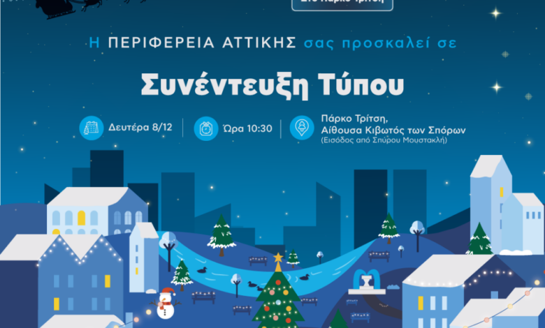 Ο Περιφερειάρχης Αττικής Νίκος Χαρδαλιάς σας προσκαλεί, τη Δευτέρα 8 Δεκεμβρίου και ώρα 10.30, σε Συνέντευξη Τύπου για την παρουσίαση του ΔΕΗ Xmas West Park, που θα πραγματοποιηθεί στο Μητροπολιτικό Πάρκο «Αντώνης Τρίτσης» (Αίθουσα Κιβωτού των Σπόρων – είσοδος από την οδό Σπύρου Μουστακλή)