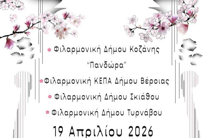 Αυτή την Κυριακή 19 Απριλίου 2026 θα πραγματοποιηθεί η 7η Συνάντηση Φιλαρμονικών του Δήμου Κοζάνης, η οποία θα λάβει χώρα στις 17:00 το απόγευμα στην Αίθουσα Τέχνης, με ελεύθερη είσοδο για το κοινό, όπου θα συμμετέχουν: η Φιλαρμονική του Δήμου Κοζάνης “Πανδώρα”, η Φιλαρμονική της ΚΕΠΑ Δήμου Βέροιας, η Φιλαρμονική του Δήμου Σκιάθου και η Φιλαρμονική του Δήμου Τυρνάβου, προσφέροντας μοναδικές μελωδίες και ξεχωριστά ακούσματα, σε ένα μουσικό πρόγραμμα φιλίας και συνεργασίας.