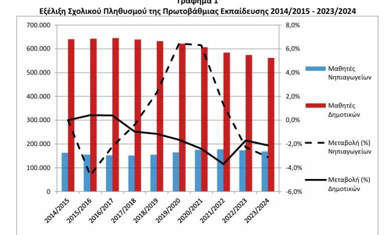 Συνολικά, οι εγγεγραμμένοι μαθητές κατά το σχολικό έτος 2023/2024, σε σχέση με το 2022/2023, παρουσίασαν μείωση κατά 3,1% στα νηπιαγωγεία και κατά 2,1% στα δημοτικά .