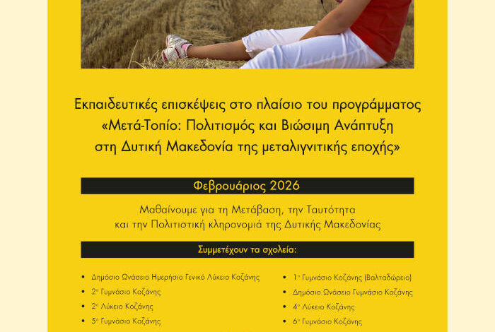 Μία σειρά εκπαιδευτικών επισκέψεων σε σχολεία της Κοζάνης (Γυμνάσια και Λύκεια) πραγματοποιείται καθ’ όλη τη διάρκεια του Φεβρουαρίου 2026 με θέμα τη Μετάβαση, την Ταυτότητα και την Πολιτιστική κληρονομιά της Δυτικής Μακεδονίας. Η δράση εντάσσεται στο Project «Μετά-Τοπίο: Πολιτισμός και Βιώσιμη Ανάπτυξη στη Δυτική Μακεδονία της μεταλιγνιτικής εποχής», που υλοποιείται από την Εταιρεία Μελέτης Προβλημάτων Παρέμβαση, σε συνεργασία με το Επιμελητήριο Κοζάνης, και με τη συμμετοχή της Διεύθυνσης Β΄ βάθμιας Εκπαίδευσης Κοζάνης.