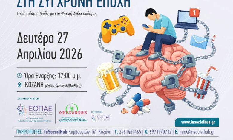Ενημερωτική ομιλία με θέμα «Κατανοώντας τον Εθισμό στη Σύγχρονη Εποχή: Ευαλωτότητα, Πρόληψη και Ψυχική Ανθεκτικότητα» διοργανώνεται τη Δευτέρα 27 Απριλίου 2026 στις 17:00 στην Κοβεντάρειο Βιβλιοθήκη Κοζάνης.