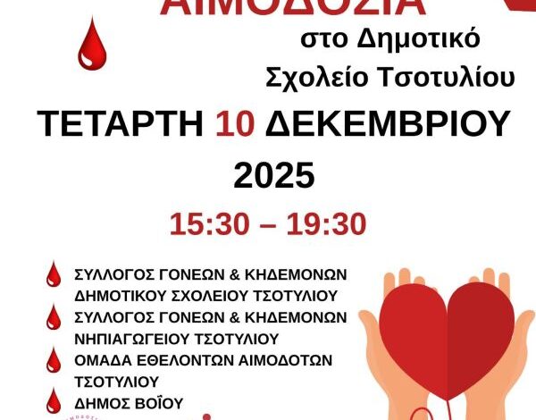Οι σύλλογοι γονέων και κηδεμόνων Δημοτικού –Νηπιαγωγείου, η ομάδα Εθελοντών Αιμοδοτών Τσοτυλίου και ο Δήμος Βοΐου διοργανώνουν Αιμοδοσία στη Δημοτική Ενότητα Τσοτυλίου την Τετάρτη  10 Δεκεμβρίου  2025   ώρα 15:30 – 19:30 στον χώρο του Δημοτικού Σχολείου Τσοτυλίου, σε συνεργασία με τον ΣΕΑ Κοζάνης «Γέφυρα Ζωής» και την Αιμοδοσία του «Μαμάτσειου» Γ.Ν. Κοζάνης